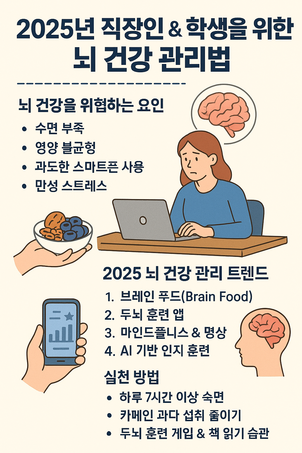 2025년 직장인 & 학생을 위한 뇌 건강 관리법✅ 왜 뇌 건강이 중요한가?집중력 저하·기억력 감퇴는 더 이상 노년층 문제만이 아닙니다.스트레스와 과로, 디지털 피로로 인해 직장인과 학생도 뇌 건강 관리가 절실해졌습니다.1. 뇌 건강을 위협하는 요인수면 부족영양 불균형과도한 스마트폰 사용만성 스트레스2. 2025 뇌 건강 관리 트렌드브레인 푸드(Brain Food)오메가3, 블루베리, 견과류, 녹차 → 기억력·집중력 강화두뇌 훈련 앱기억력 게임, 집중력 훈련 프로그램마인드풀니스 & 명상스트레스 완화, 뇌 회복력 향상AI 기반 인지 훈련맞춤형 뇌 건강 관리 서비스 확산3. 실천 방법하루 7시간 이상 숙면카페인 과다 섭취 줄이기두뇌 훈련 게임 & 책 읽기 습관규칙적인 유산소 운동✅ 결론뇌 건강은 젊을 때부터..