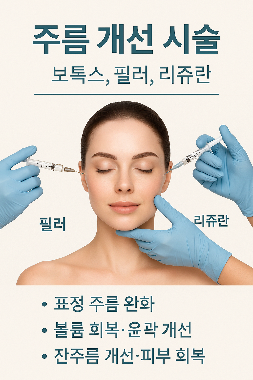 나이가 들수록 피부 속 콜라겐과 탄력이 줄어들면서 주름이 생기고, 얼굴의 볼륨도 점점 꺼지게 됩니다. 화장품만으로는 한계가 있기 때문에 많은 분들이 주름 개선 시술을 선택합니다. 대표적인 시술로는 보톡스, 필러, 리쥬란이 있으며, 각각 작용 방식과 효과가 다릅니다. 이번 글에서는 이 세 가지 시술의 특징과 차이를 정리했습니다.✅ 주름의 종류표정 주름: 웃거나 찡그릴 때 생기는 주름 (이마, 미간, 눈가)정적 주름: 표정을 짓지 않아도 보이는 주름 (팔자주름, 목 주름 등)노화성 주름: 피부 탄력 감소와 볼륨 손실로 생기는 주름👉 주름의 종류에 따라 알맞은 시술법이 다르므로 정확한 진단이 중요합니다.✅ 대표적인 주름 개선 시술1. 보톡스 (Botox)원리: 근육의 움직임을 일시적으로 마비시켜 주름 완화효..