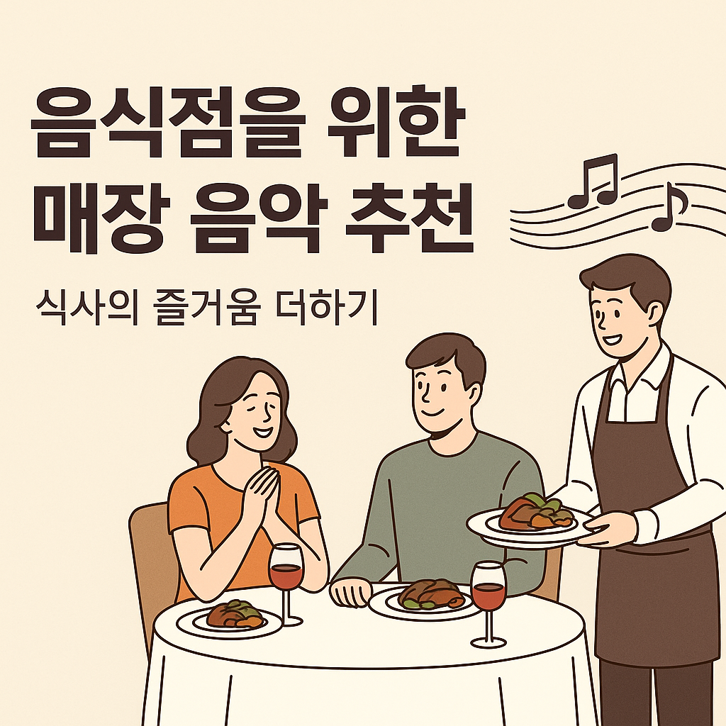 음식점에서 음악은 단순한 배경음이 아니라, 식사의 만족도를 높이고 매장의 분위기를 결정짓는 핵심 요소입니다.손님들이 편안하고 즐겁게 식사할 수 있도록 업종과 메뉴, 분위기에 맞는 음악을 선택하는 것이 중요합니다.🎶 음식점 음악 추천 장르 & 설명1. 보사노바 (Bossa Nova)설명: 브라질에서 시작된 음악 장르로, 삼바 리듬에 재즈가 결합된 부드럽고 세련된 분위기의 음악추천 상황: 양식 레스토랑, 퓨전 레스토랑추천 아티스트: João Gilberto, Stan Getz유튜브 참고: Bossa Nova Jazz Music - Relaxing Restaurant BGM2. 팝 재즈 (Pop Jazz)설명: 대중적인 팝 멜로디에 재즈 리듬을 더한 음악, 누구나 쉽게 듣고 즐길 수 있음추천 상황: 패밀리 ..