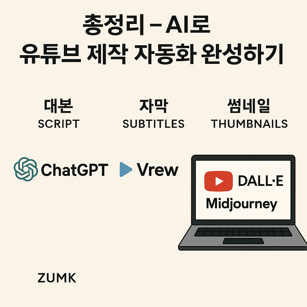 📌 총정리 – AI로 유튜브 제작 자동화 완성하기1. 지금까지 배운 것 한눈에 보기2편: 대본 작성ChatGPT → 친근하고 다용도Jasper AI → 마케팅·리뷰용 설득력 있는 대본Copy.ai → 쇼츠·짧은 영상용 대본3편: 자막 만들기Vrew → 한국어 자막에 최적화Whisper → 다국어 자막에 강점Otter.ai → 교육·강의 영상에 적합4편: 썸네일 디자인Canva AI → 초보자 친화적, 템플릿 활용DALL·E → 독창적이고 새로운 이미지Midjourney → 감각적이고 예술적인 스타일👉 결국 AI는 대본 → 자막 → 썸네일까지 영상 제작 전 과정을 자동화할 수 있습니다.2. 상황별 추천 툴 조합브이로그 채널: ChatGPT + Vrew + Canva AI제품 리뷰 채널: Jasper A..