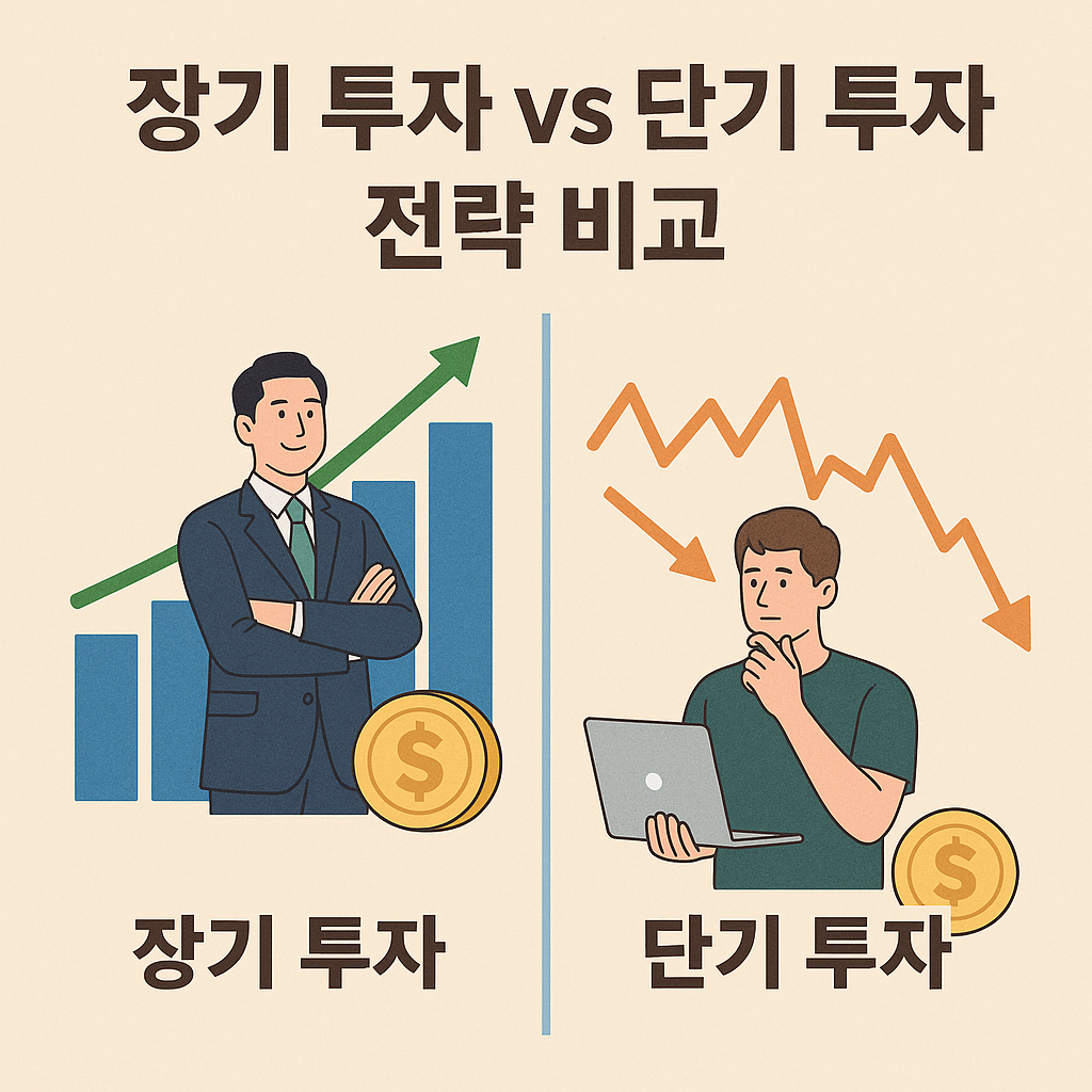 장기 투자 vs 단기 투자 전략 비교✅ 왜 장기 투자와 단기 투자를 비교해야 할까?투자에는 ‘정답’이 없습니다.어떤 사람은 장기 투자를 통해 안정적인 복리 효과를 노리고,또 다른 사람은 단기 투자로 빠른 수익을 추구합니다.👉 중요한 건 투자자의 성향과 목표에 맞는 전략을 선택하는 것입니다.1. 장기 투자 전략특징5년~10년 이상 보유ETF, 배당주, 연금저축펀드에 적합장점복리 효과 극대화시장의 단기 변동성 극복 가능세금 혜택 활용 가능단점단기 수익 실현 어려움장기적 자금 묶임2. 단기 투자 전략특징몇 일~몇 개월 단위 투자테마주, 단타매매, 가상자산 트레이딩에 적합장점빠른 수익 실현 가능시장 변동성 적극 활용단점고위험 → 손실 가능성 큼높은 집중력·지식 필요수수료·세금 부담↑3. 어떤 투자자가 적합할까..