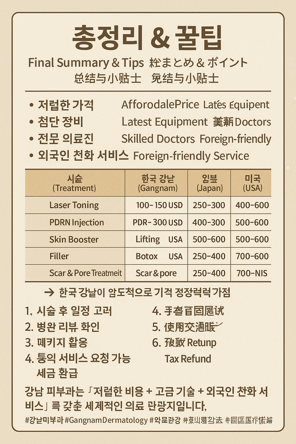 📌 총정리 & 꿀팁(Final Summary & Tips / 総まとめ&ポイント / 总结与小贴士) 1. 강남 피부과 시술의 장점저렴한 가격 (Affordable Price / 手頃な価格 / 价格实惠)첨단 장비 (Latest Equipment / 最新機器 / 最新设备)전문 의료진 (Skilled Doctors / 経験豊富な専門医 / 专业医生)외국인 친화 서비스 (Foreign-friendly Service / 外国人対応サービス / 外国人友好服务)👉 해외 대비 절반 이하 비용으로 프리미엄 시술 가능.(Receive premium care at half the price / 半額以下で施術可能 / 价格不到一半即可享受高端治疗)2. 시술별 가격 요약시술 (Treatment)한국 강남 (Gangnam)일본 (Jap..