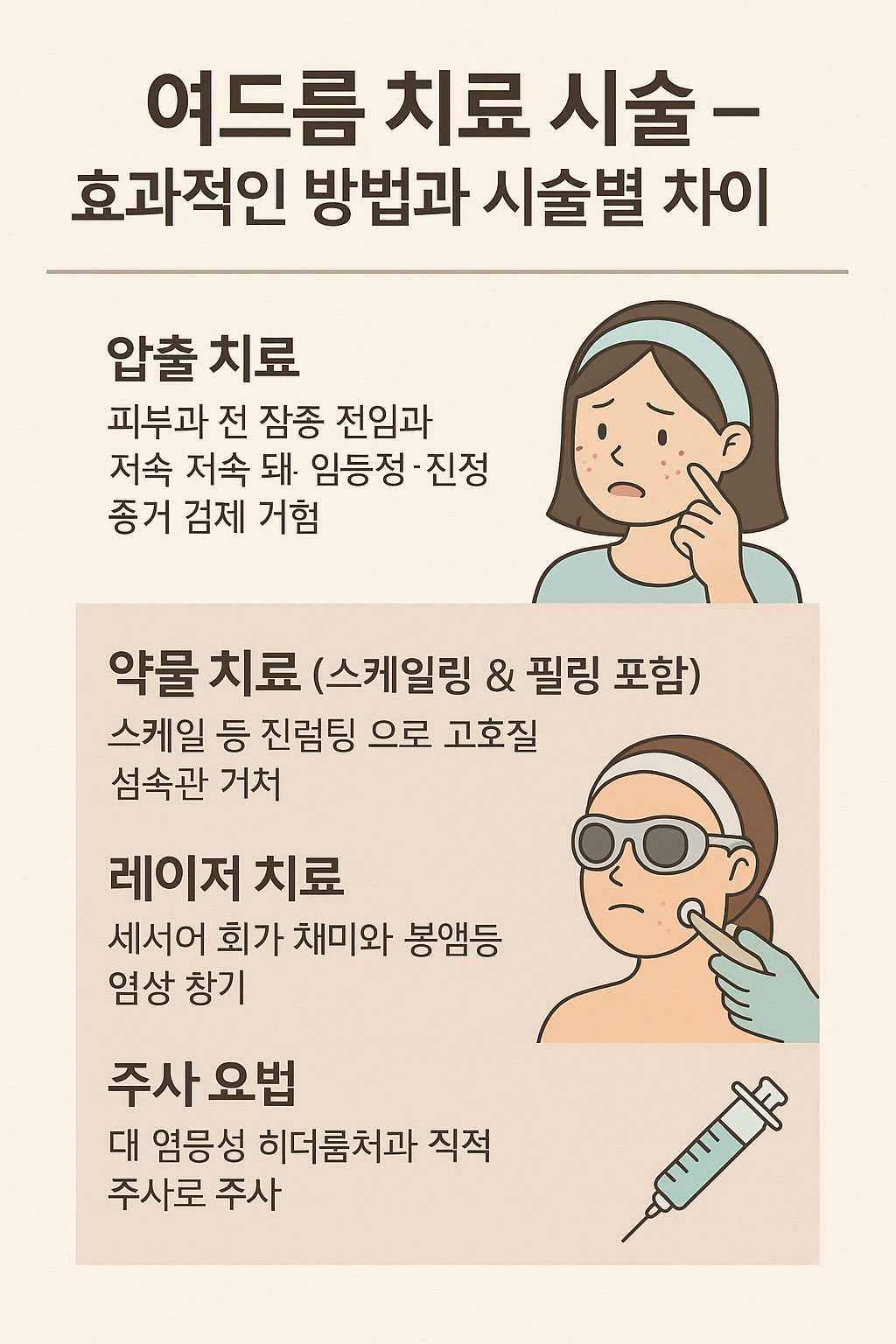 앞서 1편부터 14편까지는 여드름, 모공, 기미, 리프팅, 주름, 피부결, 홍조, 다크서클, 안티에이징, 남성 피부 시술, 시술 후 관리, 비용 가이드, 최신 트렌드 등 다양한 주제를 다뤘습니다. 이제 마지막으로, 피부 고민별로 어떤 시술을 선택하면 좋은지 한눈에 볼 수 있는 총정리 가이드를 준비했습니다.✅ 고민별 시술 추천여드름·트러블→ 압출, 필링, 여드름 레이저, 재생 주사모공·흉터→ 프락셀, 피코 레이저, 제네시스기미·잡티→ IPL, 레이저 토닝, 피코토닝리프팅·탄력→ 울쎄라, 써마지, 슈링크주름→ 보톡스(표정 주름), 필러(팔자주름), 리쥬란(잔주름)피부결·보습→ 스킨부스터, 물광주사, 샤넬주사홍조·민감성 피부→ 브이빔, 제네시스 레이저, 피부 장벽 강화 관리다크서클·눈밑 꺼짐→ 필러, 리쥬란 ..