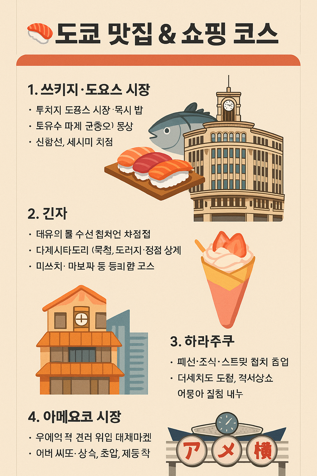 들어가며도쿄 여행의 또 다른 묘미는 바로 맛집 탐방과 쇼핑입니다. 세계적인 미식 도시이자 패션 중심지인 도쿄에서는 하루 종일 먹고, 보고, 쇼핑만 해도 시간이 모자랍니다. 이번 편에서는 쓰키지·도요스 시장, 긴자, 하라주쿠, 아메요코 시장을 중심으로 맛집과 쇼핑 코스를 소개합니다.1. 쓰키지·도요스 시장 (築地・豊洲市場)원래 도쿄 최대 수산시장이던 쓰키지 시장은 현재 소매·식당 중심으로 남아 있음새로운 도매 기능은 도요스 시장으로 이전신선한 스시, 사시미, 해산물을 맛볼 수 있는 도쿄의 대표 먹거리 성지👉 아침 일찍 방문하면 가장 신선한 해산물과 활기찬 시장 분위기를 경험할 수 있습니다.2. 긴자 (銀座)도쿄 최고의 럭셔리 쇼핑 거리명품 브랜드, 백화점, 고급 레스토랑 밀집미쓰코시, 마츠야 등 전통 백..
