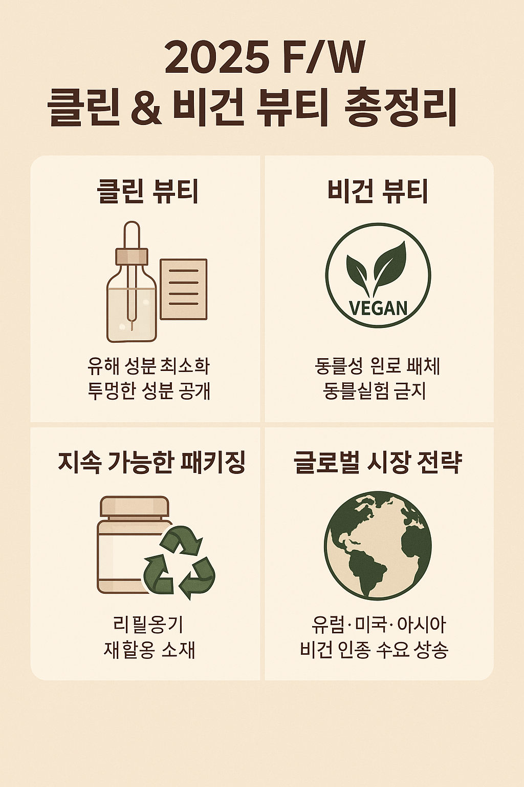 📌 한눈에 보는 2025 F/W 클린 & 비건 뷰티 총정리 1. 클린 뷰티, 이제는 필수 기준유해 성분 최소화와 투명한 성분 공개가 기본파라벤, 설페이트, 인공향 없는 화장품이 표준이 되고 있음소비자는 “안심하고 쓸 수 있는 화장품”을 브랜드 선택의 가장 중요한 이유로 꼽음2. 비건 뷰티, 윤리적 소비의 대세동물성 원료 배제, 동물실험 금지국제 비건 인증 마크가 글로벌 진출의 핵심 조건가격대는 다소 높지만, 윤리적 만족감을 우선시하는 소비자가 증가3. ESG & 지속 가능한 패키징플라스틱 줄이기, 리필형 용기, FSC 인증 종이 포장 필수화친환경 포장재는 브랜드 신뢰도와 글로벌 경쟁력 확보에 직결소비자들은 “예쁜 용기”보다 “환경을 지키는 용기”에 가치를 둠4. 글로벌 시장 속 K-뷰티 전략유럽: 동..