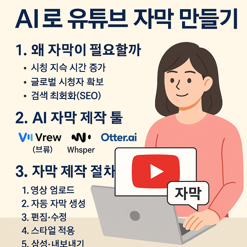 📌 AI로 유튜브 자막 만들기1. 왜 자막이 필요할까?유튜브 영상에서 자막은 단순히 글자만 보여주는 게 아닙니다.시청 지속 시간 증가: 소리를 꺼놓고 보는 사람도 내용을 이해 가능글로벌 시청자 확보: 영어·일본어·중국어 등 외국어 자막으로 시청자 확대검색 최적화(SEO): 자막 텍스트가 영상 검색 노출에 긍정적 영향👉 자막은 조회수와 구독자 증가에 직접적으로 연결됩니다.2. AI 자막 제작 툴(1) Vrew (브류)특징: 한국어 지원이 매우 뛰어남장점: 영상 음성을 자동으로 텍스트로 변환, 편집도 간단활용 예시: “10분 영상 → 5분 만에 자막 완성”👉 한국 크리에이터라면 가장 많이 사용하는 자막 툴.(2) Whisper (OpenAI)특징: 다양한 언어를 인식하는 AI 음성 인식 모델장점: 영어..